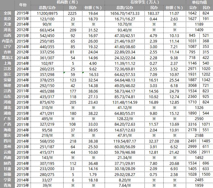 截至2015年全国共有民办中等职业学校2225所,占全国总数的19.64%,较2011年减少631所,占全国总数百分比下降2.50;在校生人数183.37万人,占全国总数的11.07%,较2011年减少85.88万人,占全国总数百分比下降1.14;单位均值为824人,较2011年减少10人。据不完全统计,全国31个省市自治区中民办中等职业学校数量占总数较高的几个省份依次是:海南(2014年38.95%)、四川(2014年38.38%)、湖南(2015年38.22%)、江西(2011年38.06%)、陕西(2014年36.48%)、广西(2011年33.03%)、安徽(2014年32.54%)、河北(2012年31.52%)、山东(2015年27.13%)、内蒙(2015年26.00%);在校学生人数占总数较高的省份依次是:四川(2014年27.08)、安徽(2014年25.54%)、江西(2011年24.79%)、云南(2015年21.42%)、陕西(2014年20.68%)、湖南(2015年15.12%)、海南(2014年13.91%)、广西(2011年13.69%)、河南(2015年12.85%)、山东(2015年12.74%);民办中等职业学校单位均值较高的省份依次是:云南(2015年2911人)、新疆(2015年1500人)、四川(2014年1485人)、安徽(2014年1342人)、浙江(2015年1202人)、广西(2011年1071人)、江苏(2014年1020人)、山东(2015年925人)、河南(2015年824人)、江西(2011年823人)。各省市自治区具体情况如下表所示: