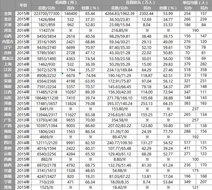 截至2015年全国共有民办幼儿园14.64万所,占全国总数的65.44%,较2011年增加3.1万所,占全国总数百分比下降3.74;在园幼儿2302.44万人,占全国总数的53.99%,较2011年增加608.23万人,占全国总数百分比上升4.52;单位均值157人,较2011年增加10人。据不完全统计,全国31个省市自治区中民办幼儿园数量占总数较高的几个省份依次是:江西(2014年89.39%)、广西(2015年86.60%)、海南(2014年86.54%)、湖南(2015年83.38%)、四川(2014年82.50%)、河南(2015年79.08%)、浙江(2015年74.94%)、黑龙江(2014年74.54%)、辽宁(2014年70.97%)、福建(2014年70.57%);在园幼儿数量占总数较高的依次是:海南(2014年77.70%)、江西(2014年72.94%)、湖南(2015年71.67%)、河南(2015年64.35%)、浙江(2015年62.51%)、陕西(2014年61.24%)、广西(2015年59.80%)、辽宁(2014年59.61%)、安徽(2014年56.12%)、黑龙江(2014年56.00%);民办在园幼儿单位均值较高的依次是:江苏(2014年358人)、上海(2014年282人)、北京(2015年239人)、安徽(2014年231人)、宁夏(2014年207人)、河南(2015年183人)、浙江(2015年178人)贵州(2013年175人)、陕西(2014年170人)、新疆(2015年168人)。各省市自治区具体情况如下表所示: