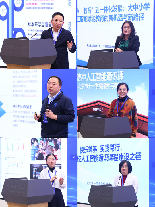 专家报告环节,来自北京石油化工学院的刘强教授、北京工业大学的闫健卓教授、北京信息科技大学的陈雯柏教授、北京市十一学校的聂璐老师、北京学校的张加莎老师、北京第一师范附小的李婷老师,分别就各学段AI通识课的建设经验进行了主题报告,为促进优质教育资源共享和大中小学贯通式创新人才培养提供了可行性探索。