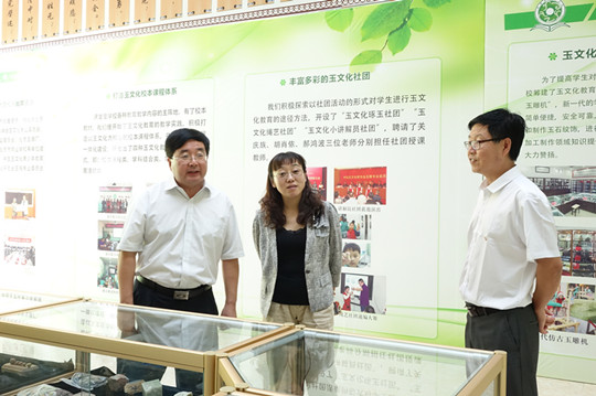 本次现场会活动分为三个主题环节:首先来宾们参观了学校玉文化主题校园,观看了学校玉文化教育成果展室和玉雕实操基地,欣赏了玉雕大师展室的精美玉雕作品;随后分组听取了学校四种玉文化教学模式的12节玉文化课;然后来宾们齐聚学校大会厅,观看了学校玉文化专题宣传片,欣赏了学生们的玉文化汇演,听取了邵国富校长的学校玉文化特色工作汇报。