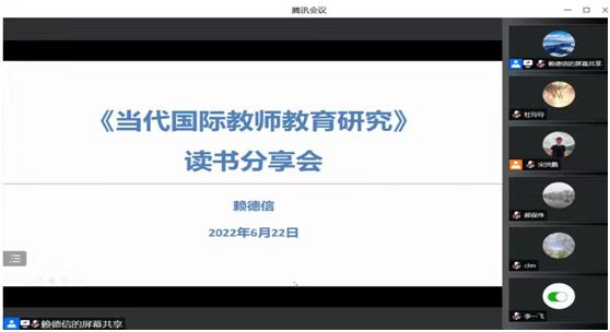 6月22日,教师研究中心通过线上与线下相结合的方式组织开展本学期第五次读书分享研讨会,教师研究中心全体人员参与了分享研讨。本次读书会由赖德信副研究员带领大家深度研习《当代国际教师教育研究》一书。赖老师根据书中具体内容,首先对教师专业发展与专业性、专业人员等问题进行了梳理。主要从教师专业发展内涵、教师作为专业人员的演变对教师专业发展的循环系统进行了介绍。其次,对国外教师专业发展的基本领域进行了介绍。再次,对国外教师专业发展的四种模式(目标视野模式、知能转化模式、标准视野下的模式、文化视野下的模式)进行了具体分析。第四,系统地对有效教师专业发展的特征与要求进行了讲解。第五,具体介绍了国外教师专业发展的取向与相关理论。第六,对国外职前教师教育的内涵与形态、国外职前教师教育改革、国外教师在职培训形态、国外教师培训系统的理论形以及对中国教育的启示等问题进行了系统介绍。最后,中心全体人员对教师专业发展特征、培训方式、教师政策研究等问题进行了深入讨论。