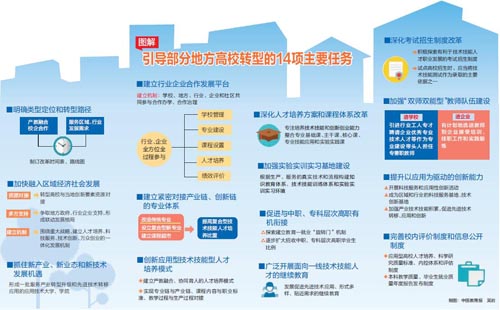 记者今天从教育部获悉,教育部、国家发改委、财政部近日发布《关于引导部分地方普通本科高校向应用型转变的指导意见》(以下简称《指导意见》)。《指导意见》提出了引导部分普通本科高校向应用型转变的14项主要任务,包括明确类型定位和转型路径,加快融入区域经济社会发展,抓住新产业、新业态和新技术发展机遇,建立行业企业合作发展平台等。推动转型发展高校把办学思路真正转到服务地方经济社会发展上来,转到产教融合校企合作上来,转到培养应用型技术技能型人才上来,转到增强学生就业创业能力上来,全面提高学校服务区域经济社会发展和创新驱动发展的能力。
