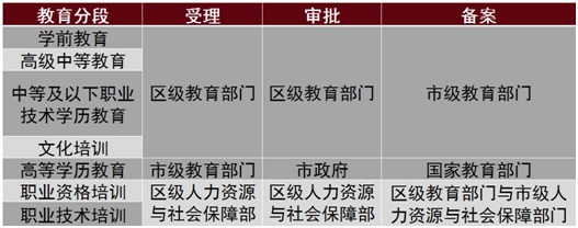 民办国际学校筹办时审批申请部门为市级教育行政部门,而在《上海市民办学校分类许可登记管理办法》中将这一权限下放至区级教育部门,“设立实施学前教育、义务教育、高级中等教育、中等及以下职业技术学历教育以及以文化培训为主的民办学校,由学校所在地的区教育部门审批,并报市教育部门备案。”