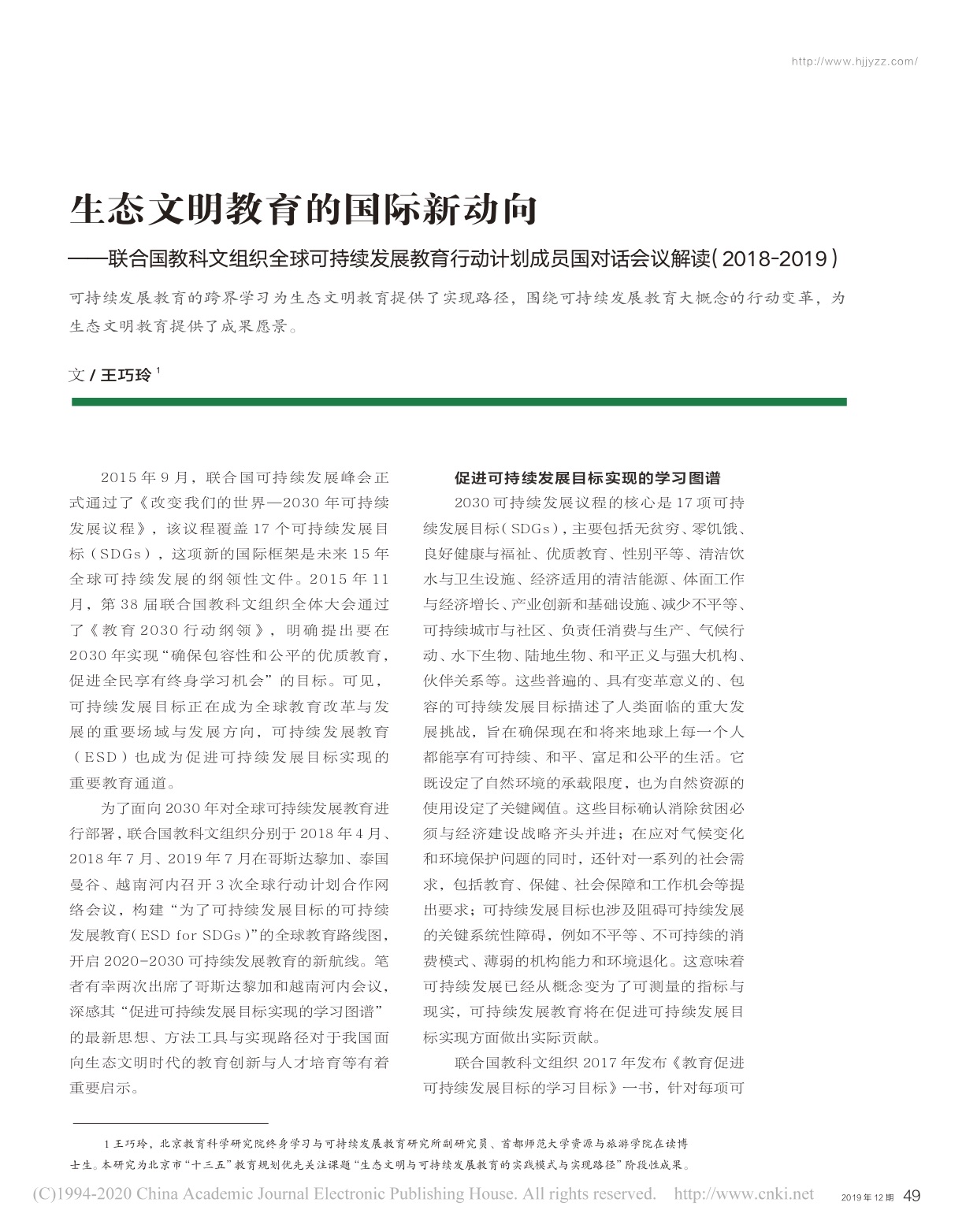 生态文明教育的国际新动向——联合国教科文组织全球可持续发展教育行动计划成员国对话会议解读(2018-2019)